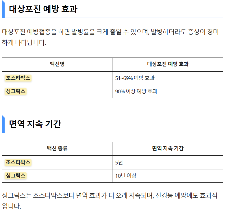 - 대상포진 예방 백신(싱그릭스, 조스타박스) 접종으로 발병 위험 감소